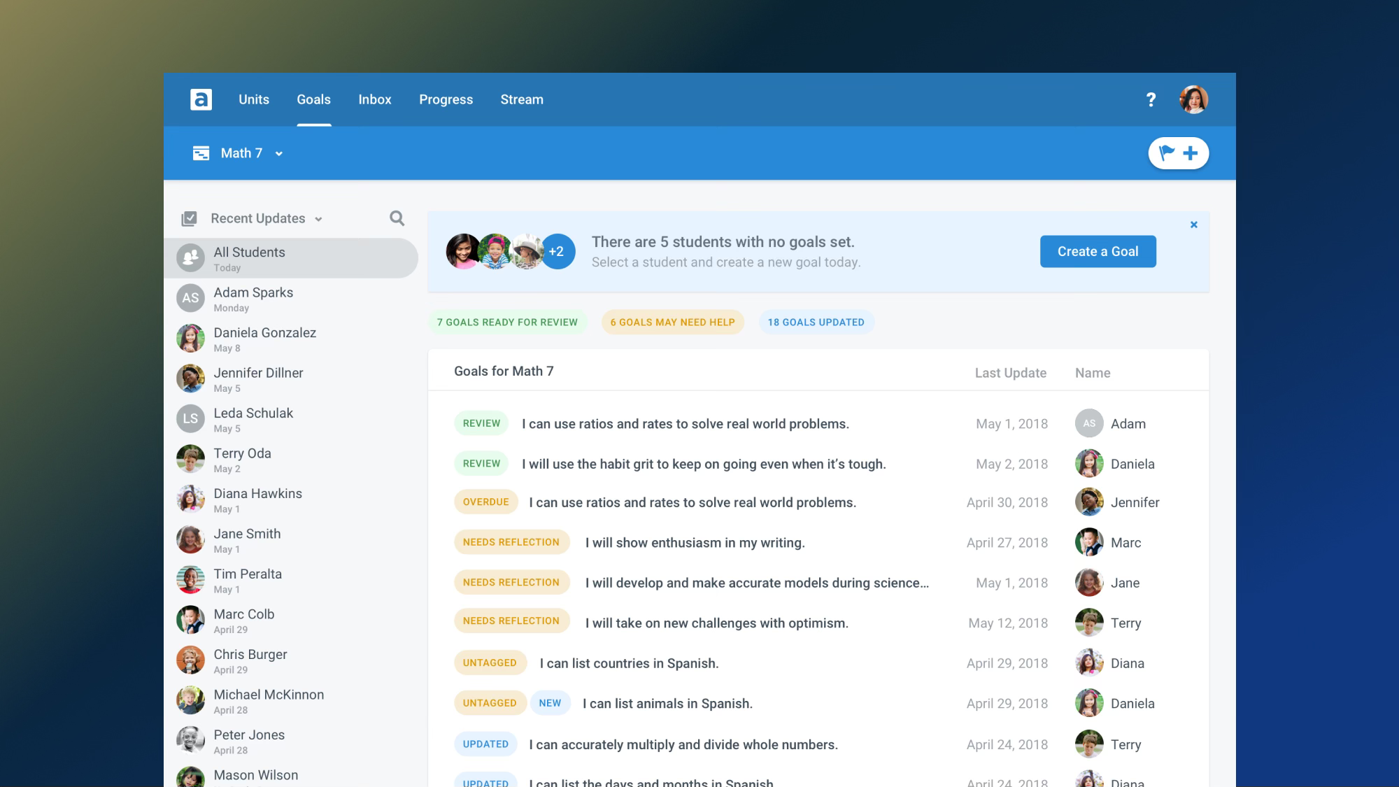 AltSchool's platform allows educators to track learner- and educator-made goals. However, getting an overview of a group of learners is difficult and tedious. I created several proposals for a goal dashboard, allowing educators to glimpse progress for groups at a glance.