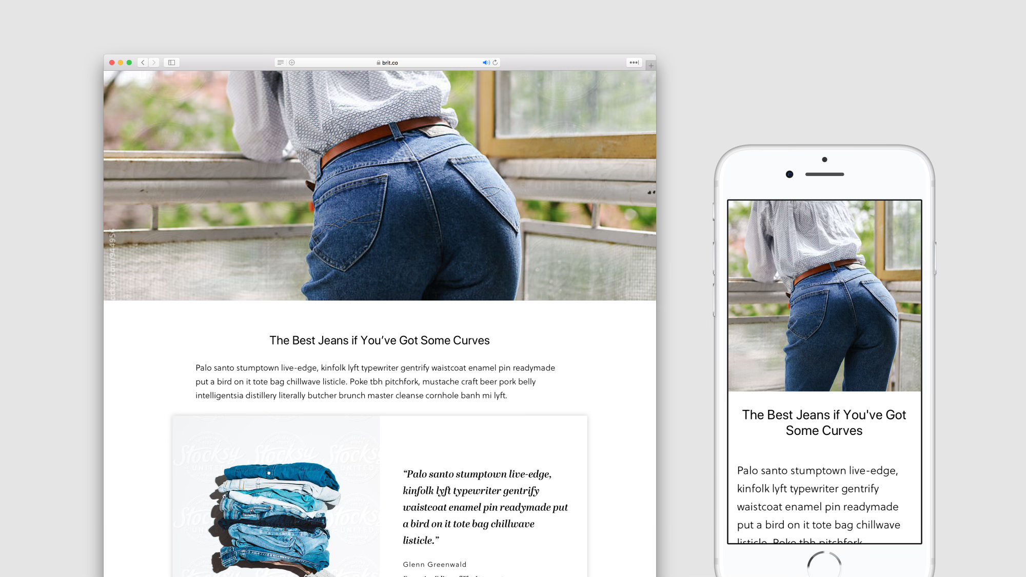 I drew from foundational research I conducted with Brit + Co readers, prioritizing readers who did serious research to make their lives easier. How might we help our reader go deep on a beauty staple or fashion trend? I conducted a competitive analysis and contrasted results with experiences flagged by our sales team as stellar and sellable. I paired with an editorial lead to generate format ideas ranging from boomerang-like GIFs to atmospheric videos. I built a desktop and mobile prototype of the denim guide in Codepen so our photo contributors and editorial staff could visualize and ideate with design and eng in real time.