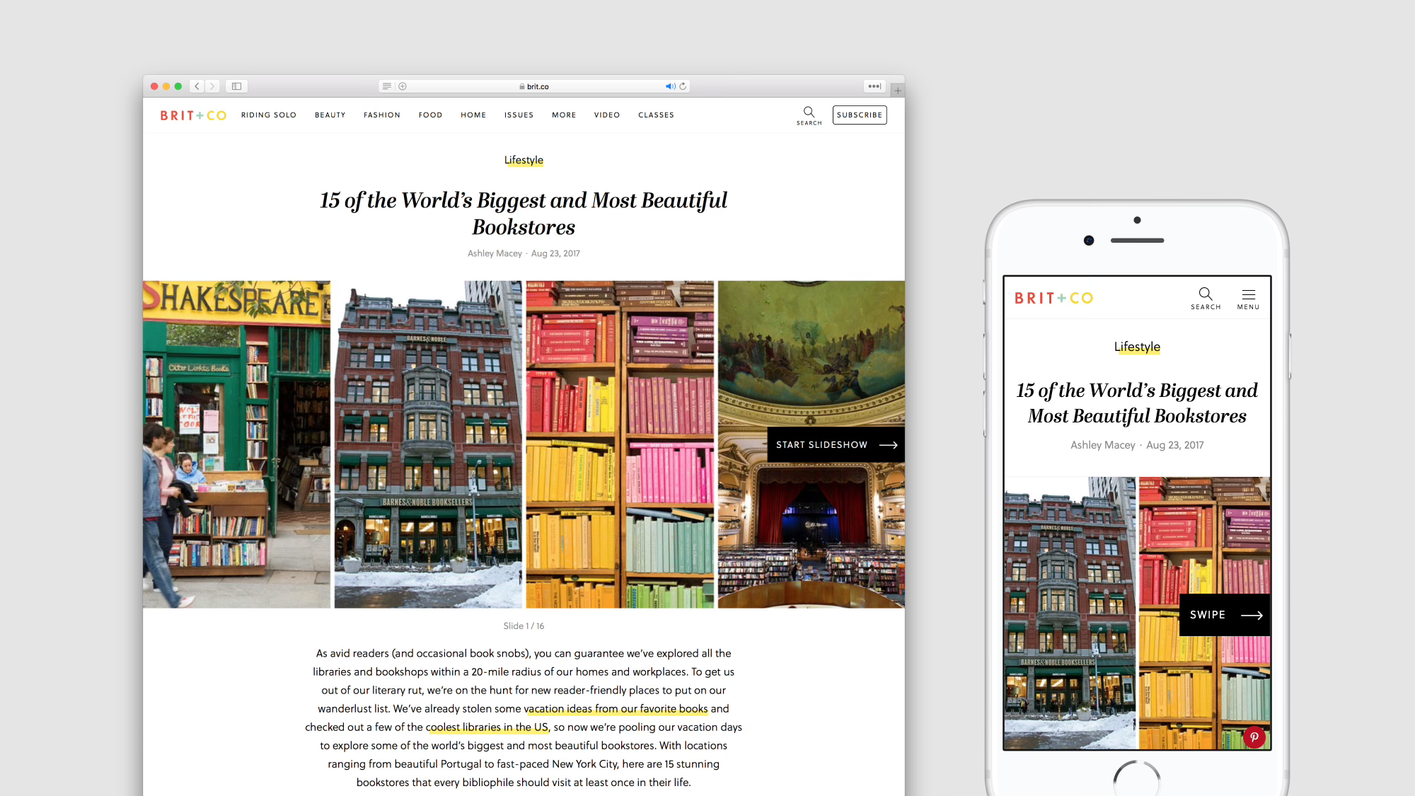At Brit + Co, I collaborated with editorial and creatives to create beautiful, evergreen content optimized for search engines. Readers and sponsors expected a visually-rich experience from Brit + Co, but our frontend was not performant with a 67 on PageSpeed insights, affecting SEO ranking. We wanted to build performant storytelling experiences with our new guide initiative that still looked good.