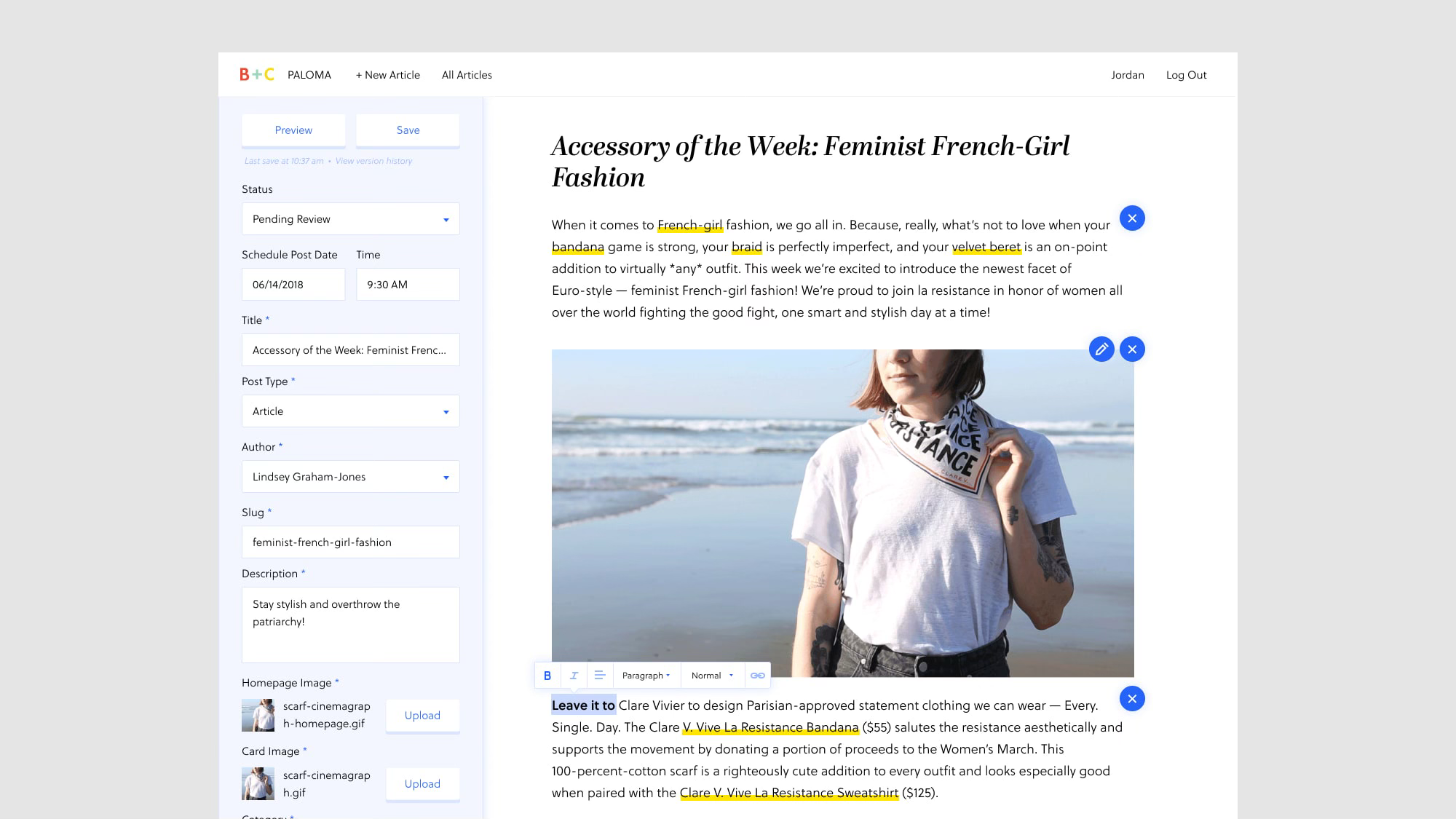 We finalized the following features with stakeholders for the MVP: batch upload photos, easily reordering and updating slides, WYSIWYG and keyboard text formatting, copy/paste stripping formatting, and viewing the slideshow in the CMS. Later, we added keyboard shortcuts and affiliate link converters.