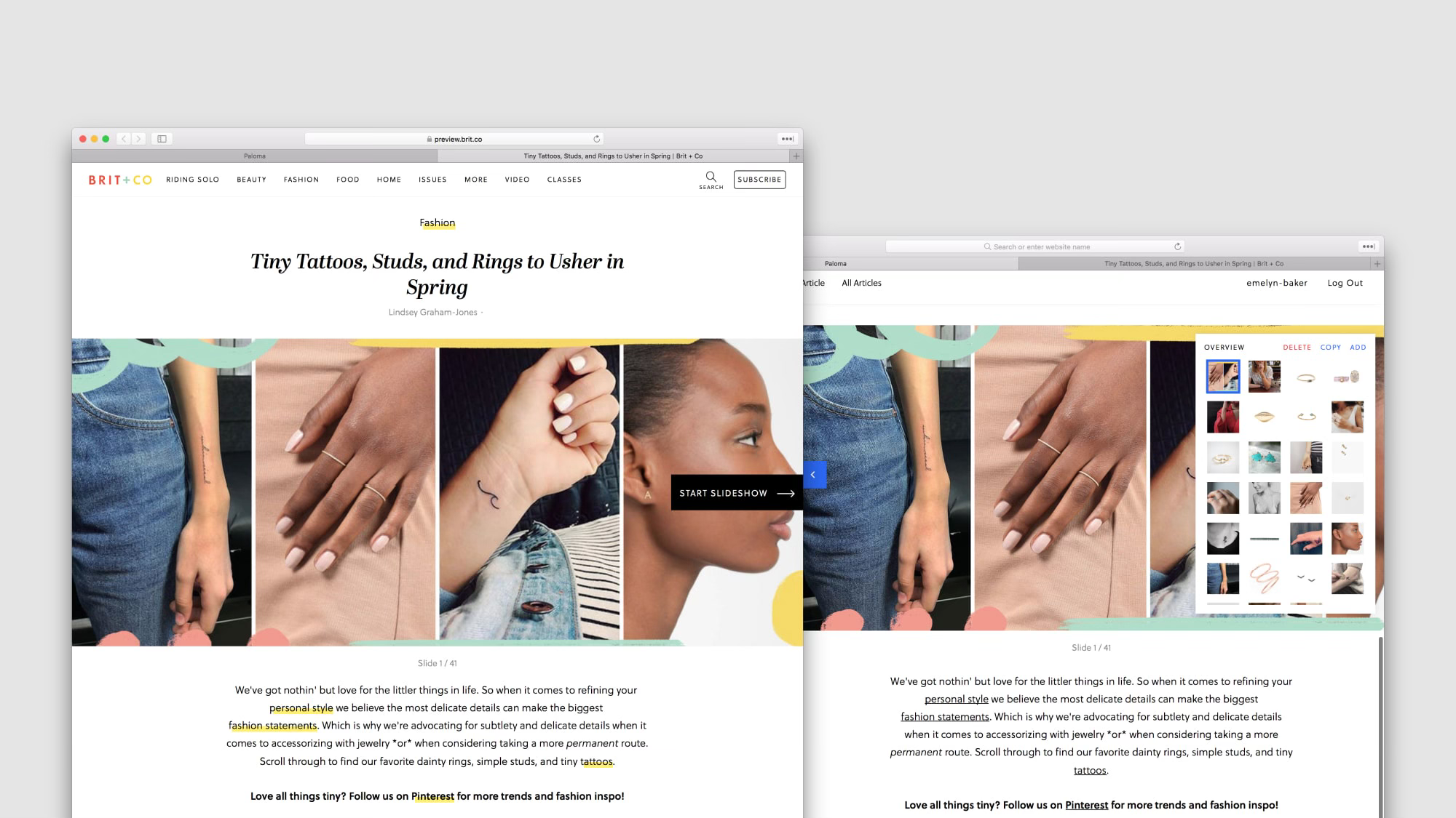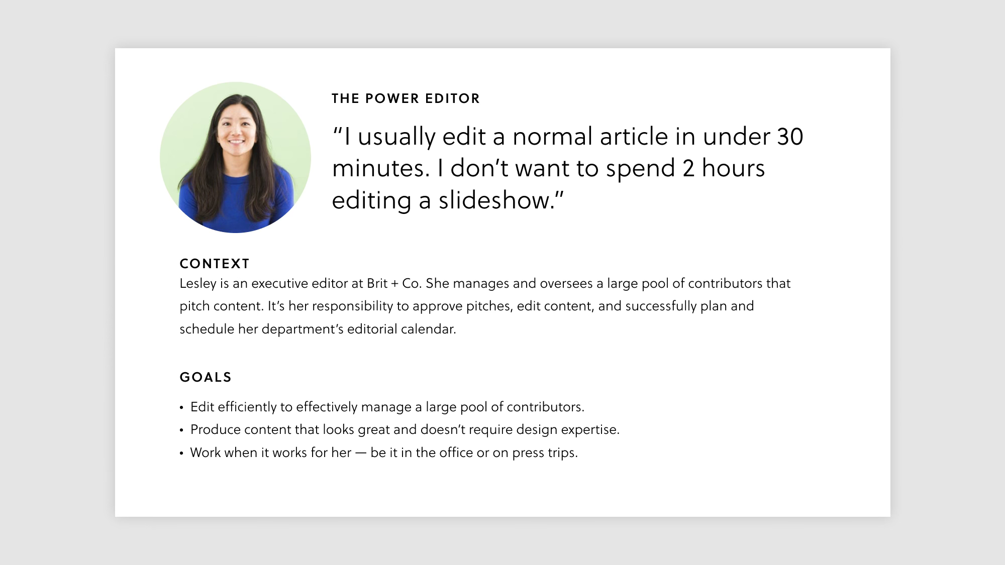 Brit + Co launched slideshows, resulting in increased engagement and reader satisfaction. However, editors found creating slideshows painful through a hacked-together tool built on top of Wordpress.